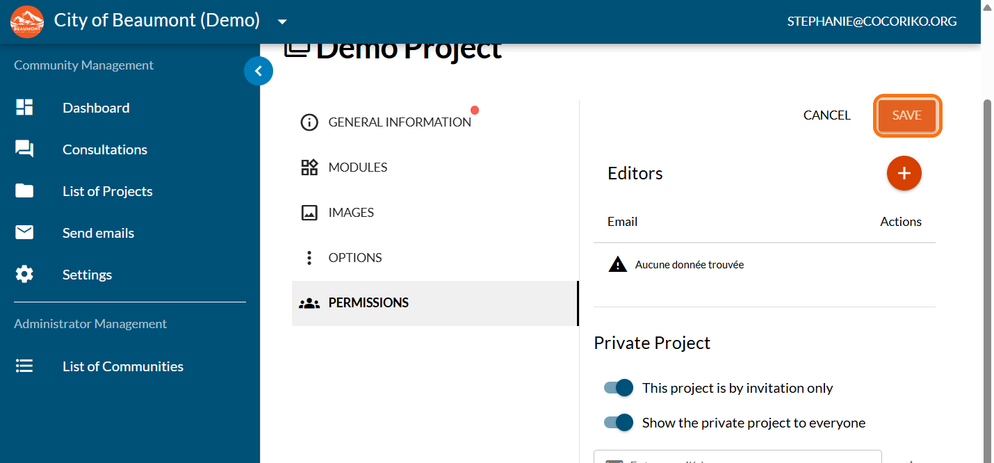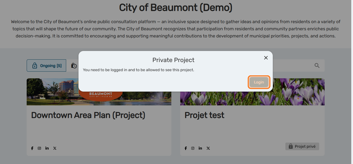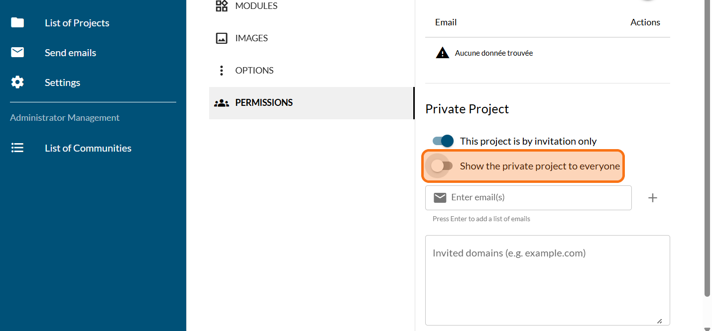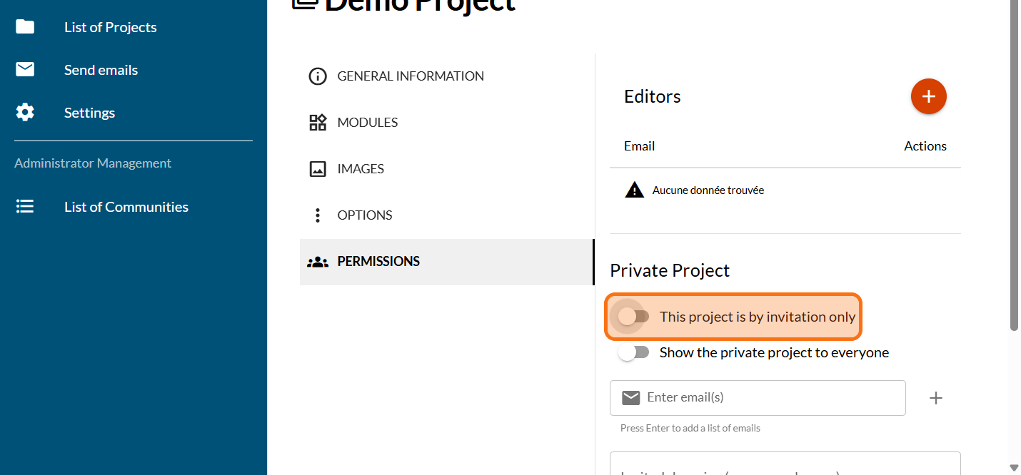 An invitation-only project is accessible only to a group of people you invite. This type of project is also known as a private project. Invitation-only projects are useful for committees, working groups or internal consultations with an organisation’s employees. This mode is also useful for sharing a project that needs to be approved or reviewed by people who are not administrators.