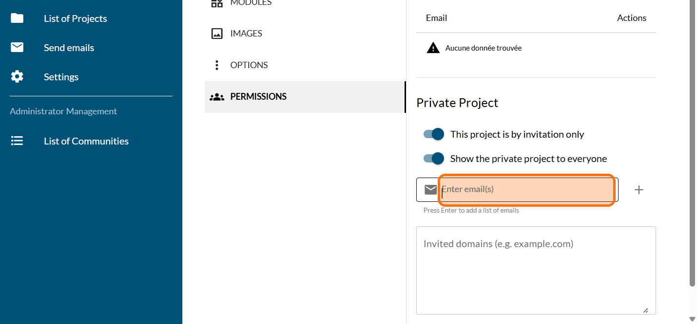 Enter the email addresses of the people who will have access to the project. You can also use a domain to grant access to everyone with an email address ending in that domain (for example: @cocoriko.org)
