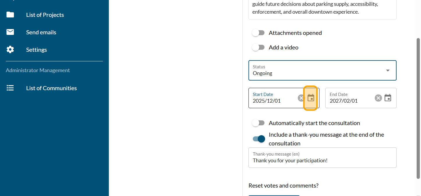 Click on the "Start date" calendar if you want to display the opening date of your consultation. This is optional.