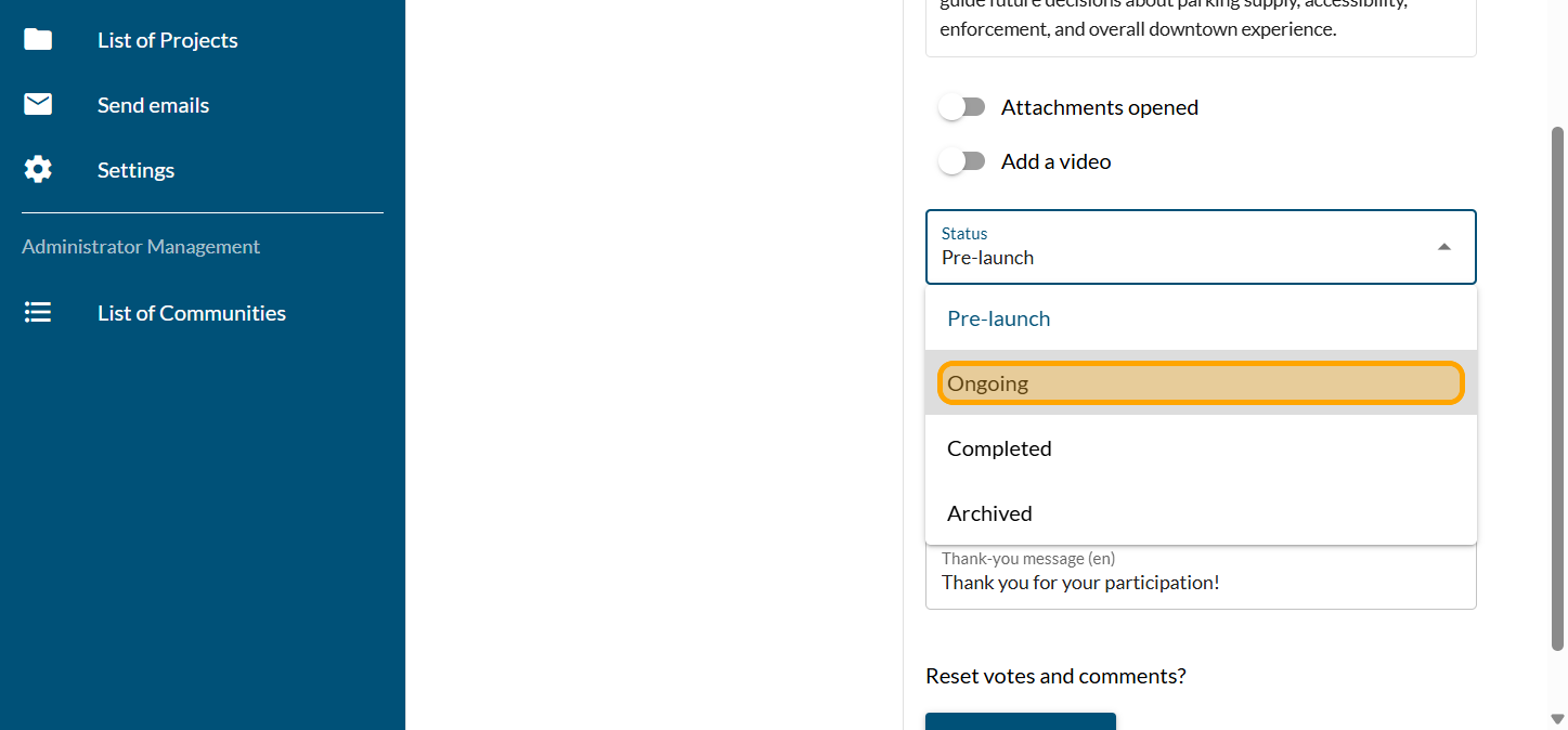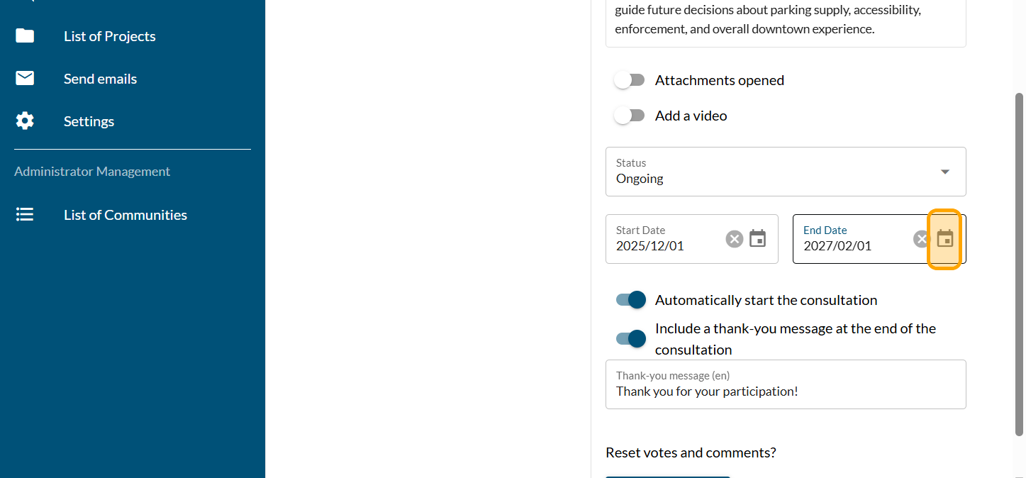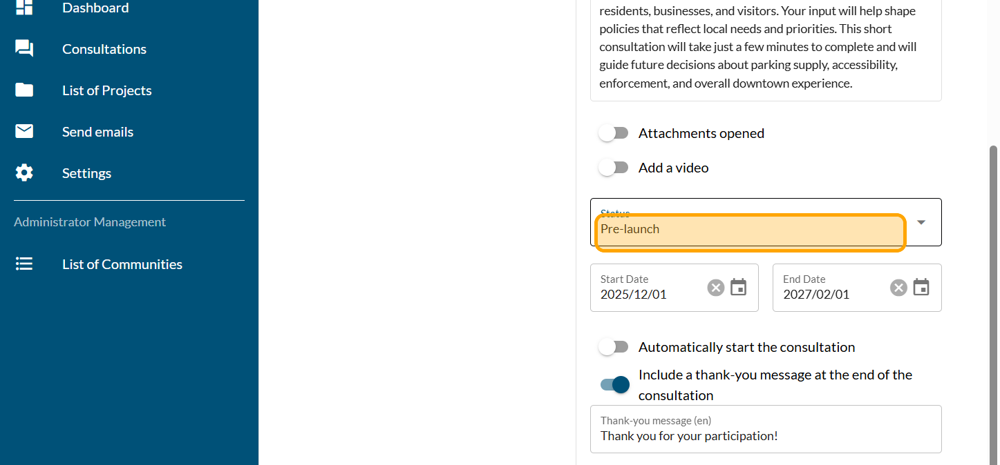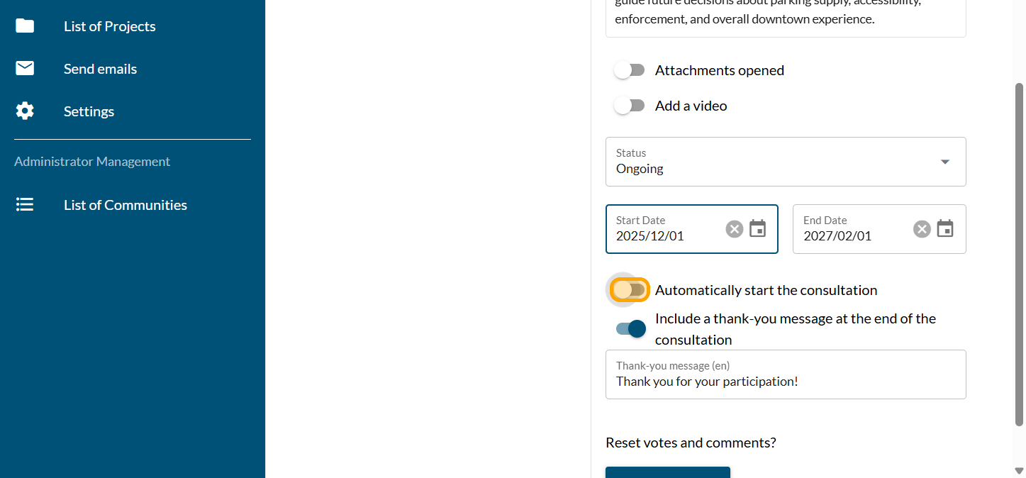 Activate the "Automatically start the consultation" button if you want the survey to be online at 7 a.m. on the selected day. The time cannot be changed. The consultation can be launched manually.