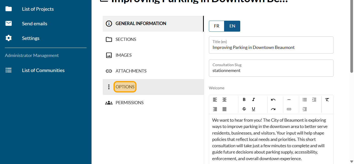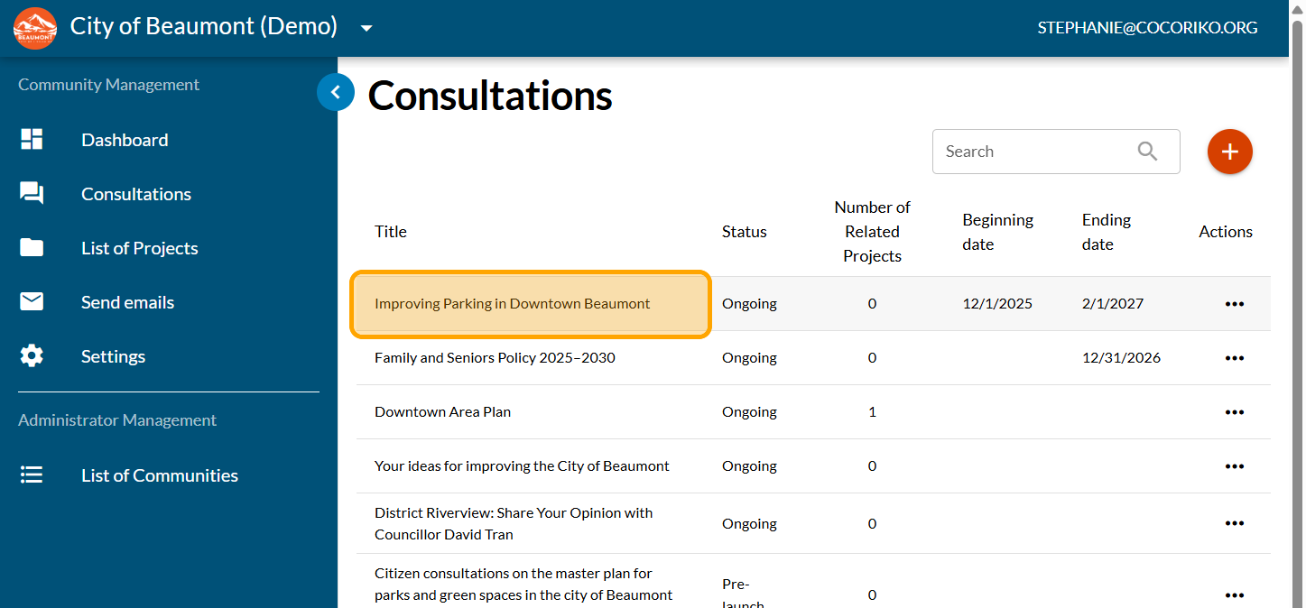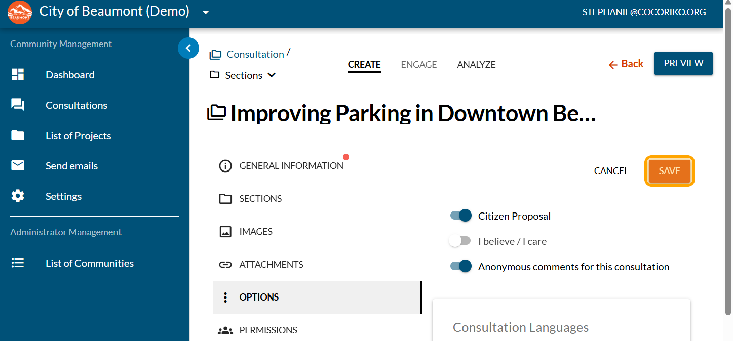 By default, the first and last names of individuals who submit comments are displayed alongside their comments. The first and last names are displayed as entered when the individual submitted their demographic information. The administrator may choose to make comments anonymous for one or more consultations to protect the anonymity of the participants.