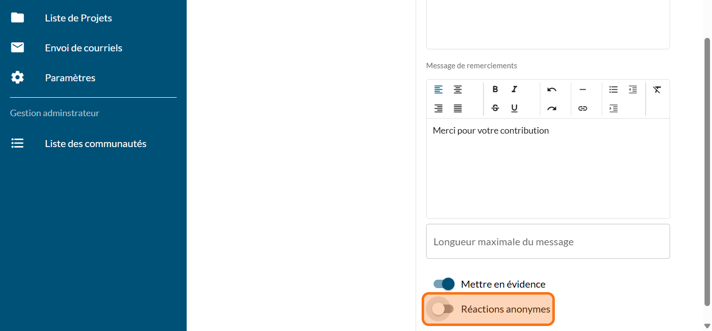Cliquez sur "Réactions anonymes" si vous désirez masquer les noms des personnes qui commenteront