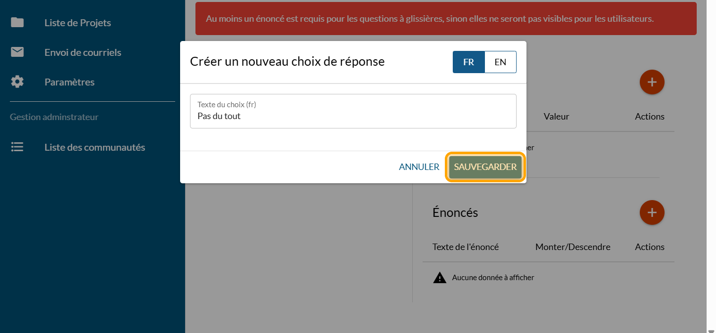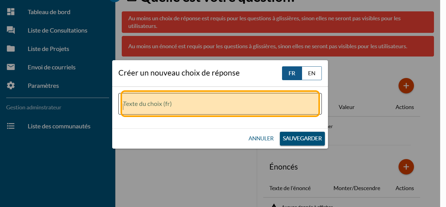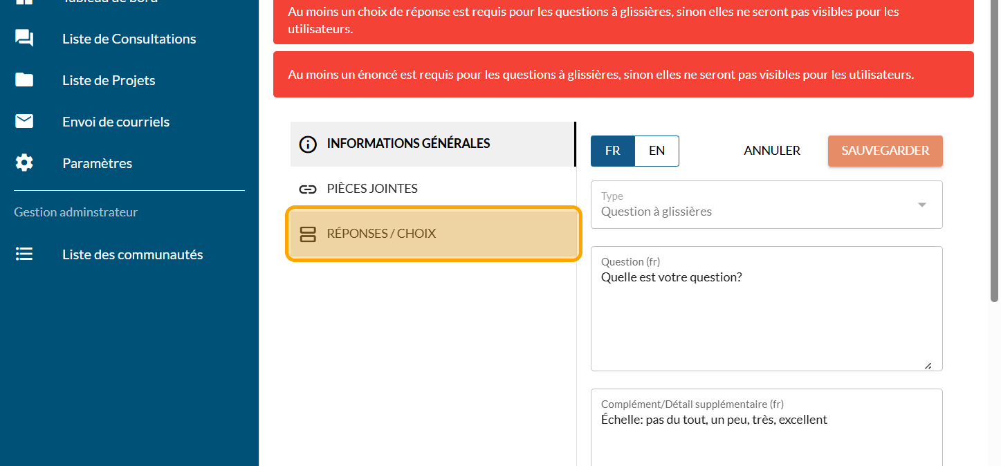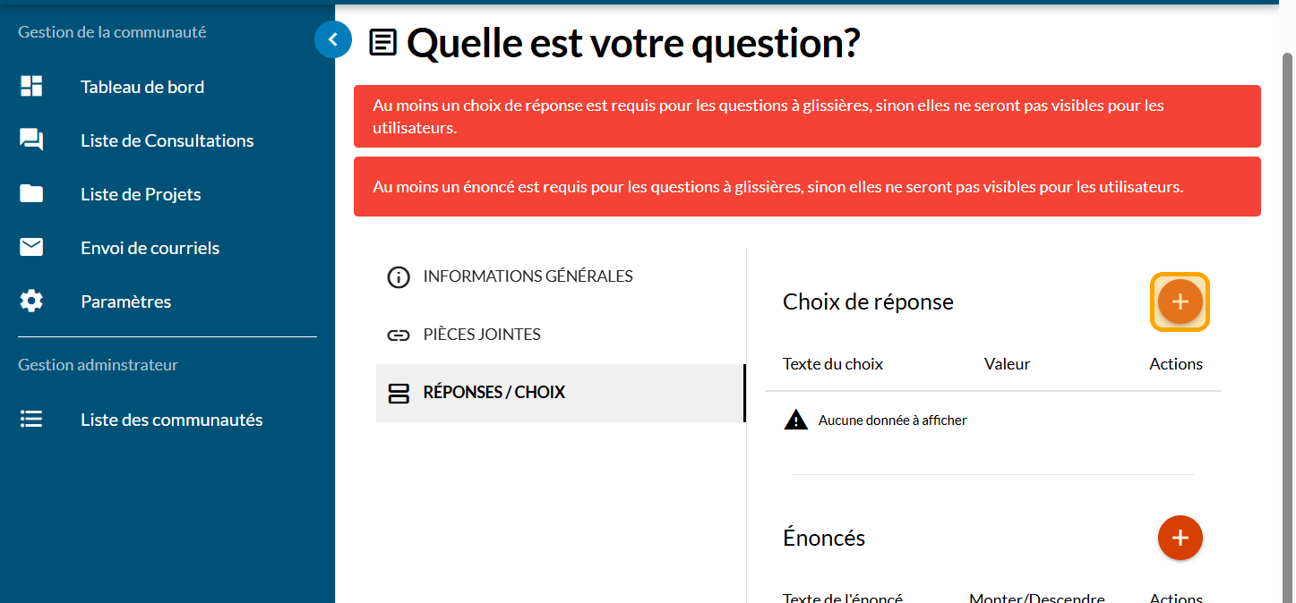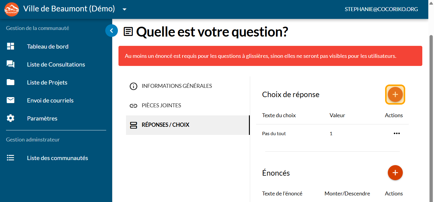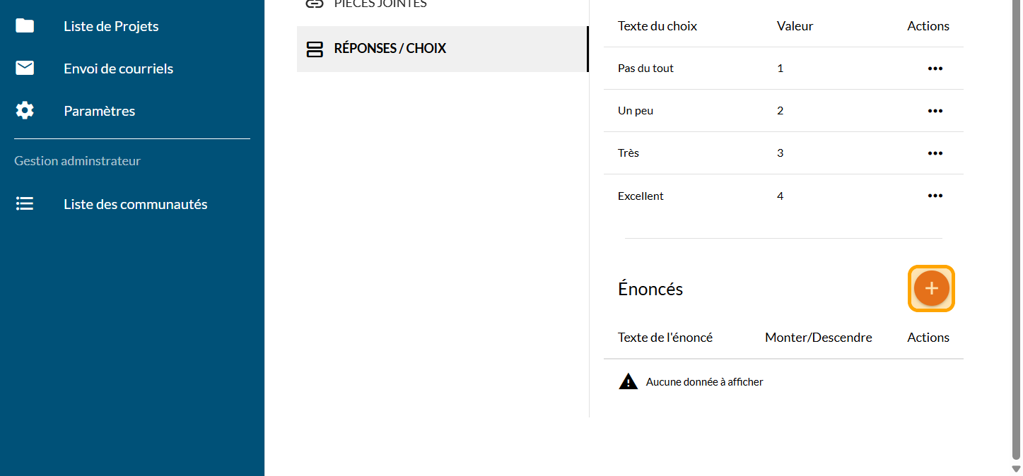 Cliquez sur le signe PLUS pour ajouter un "Choix de réponse" : les éléments à taper ici sont l'échelle de votre question à glissière