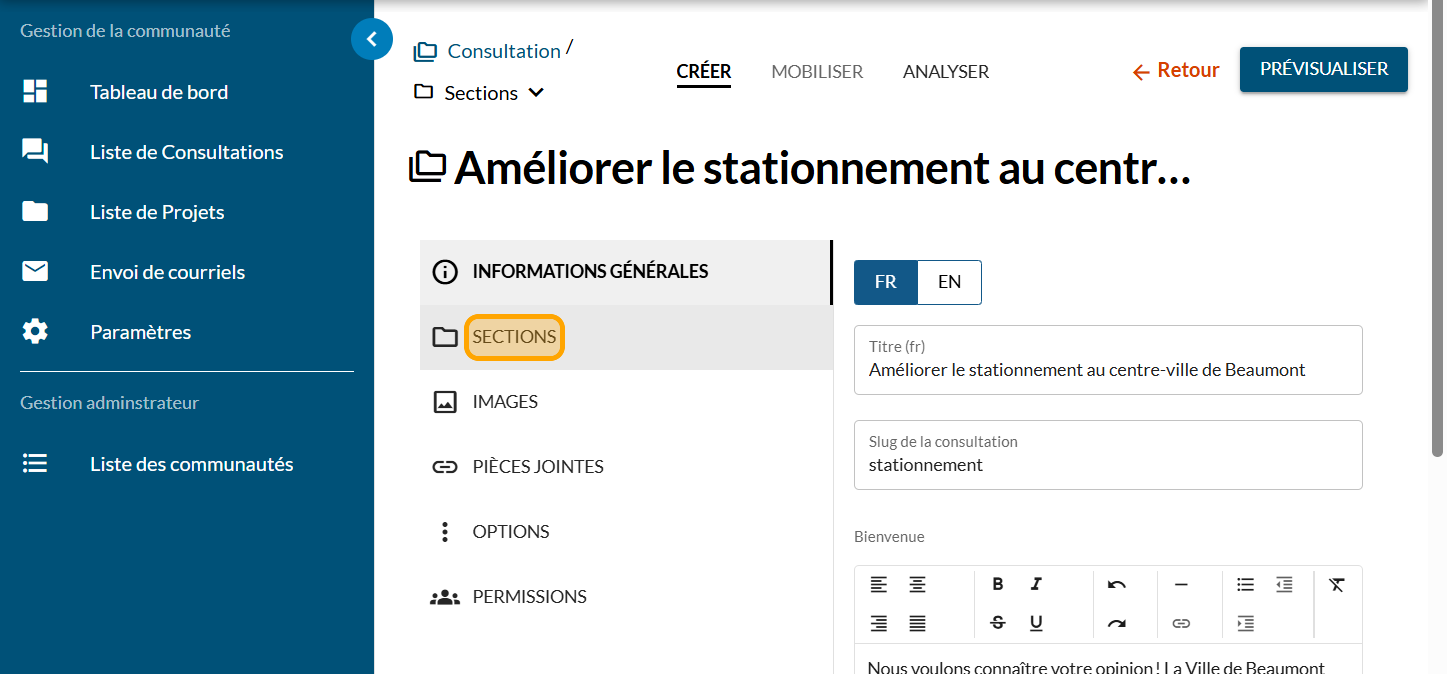 Cliquez sur la section pour laquelle vous voulez ajouter une question