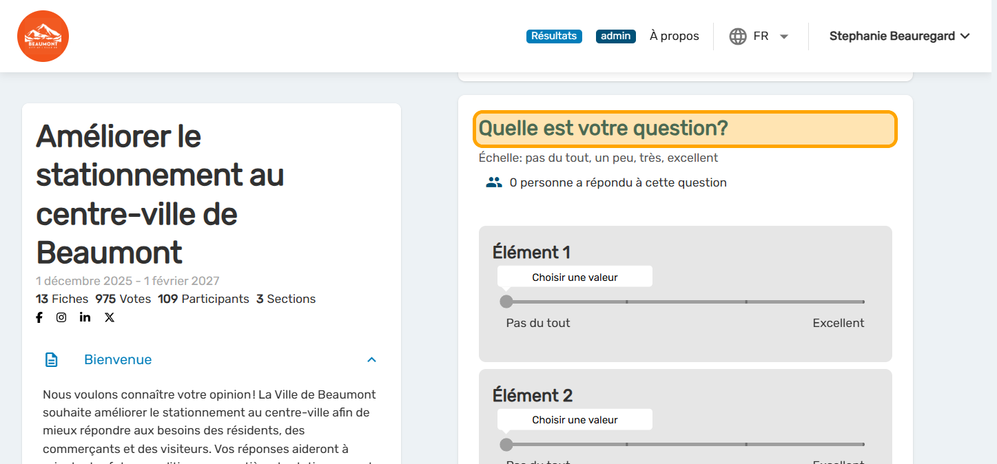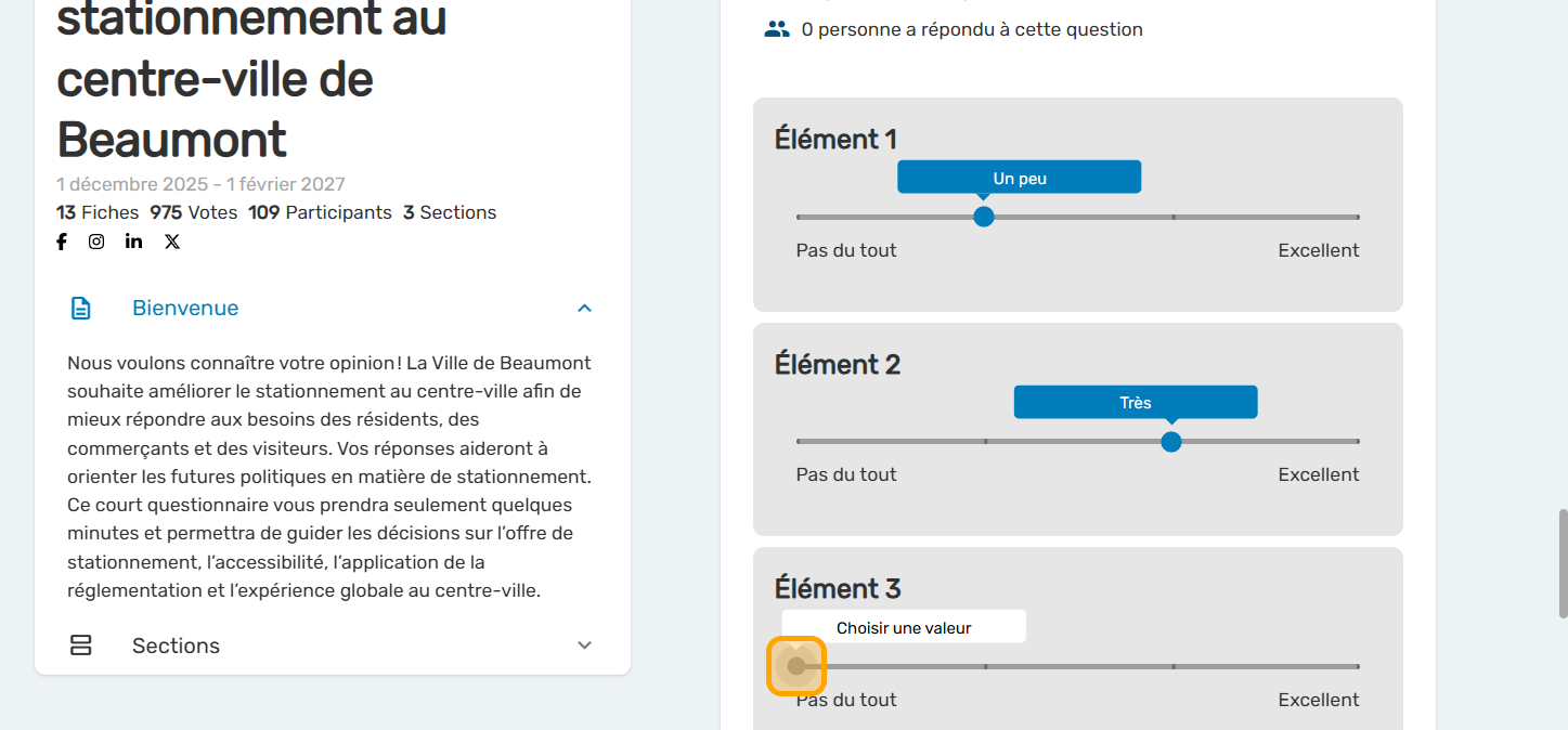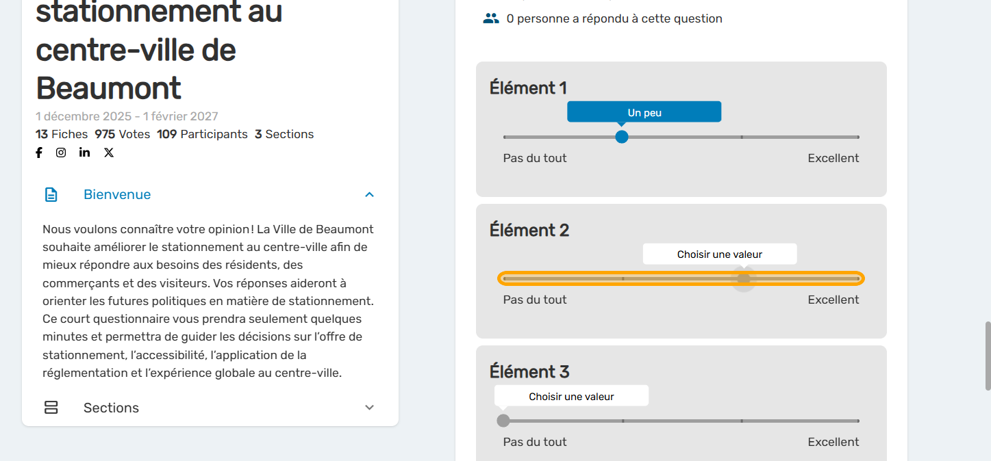 La question à glissière est un format utile lorsque vous avez les mêmes choix de réponse pour plusieurs éléments. Elle reproduit la question de type "Likert" dans un format plus ludique et plus accessible sur cellulaire.