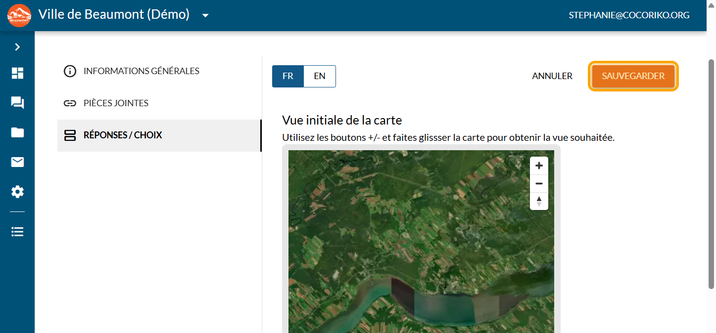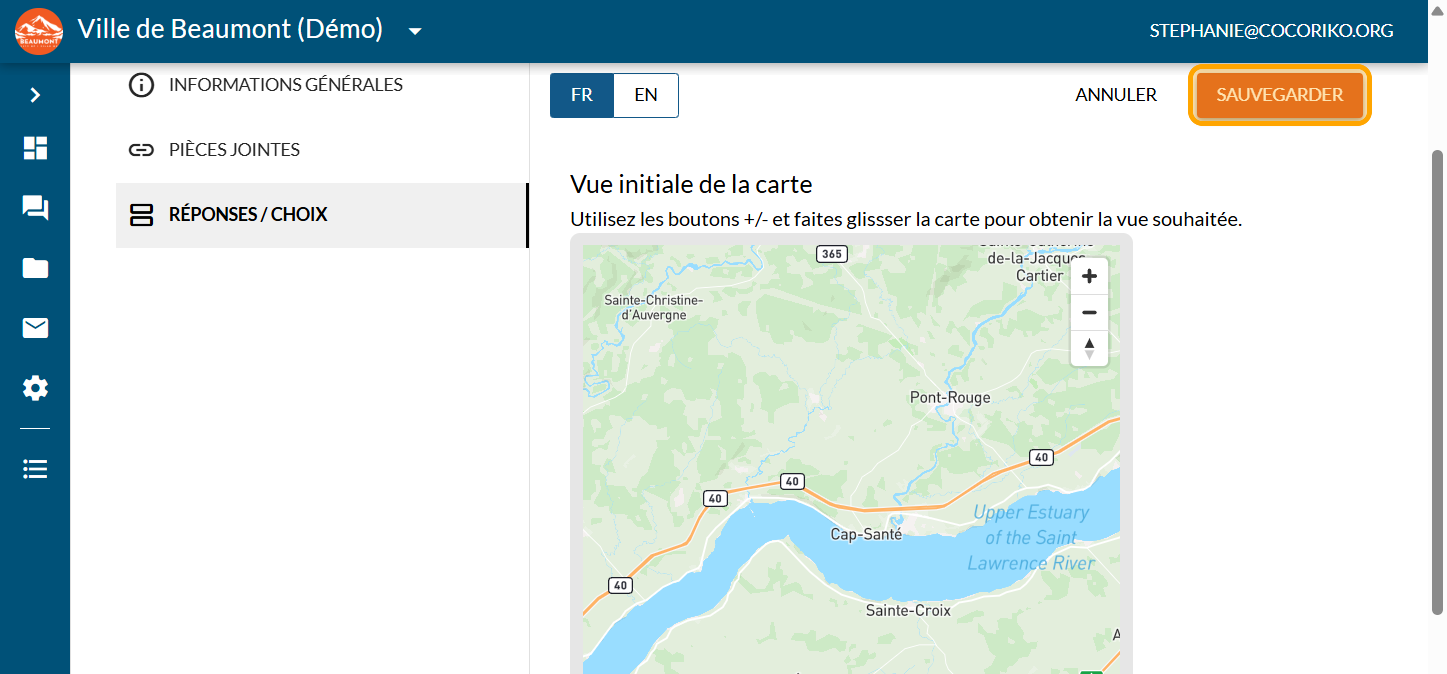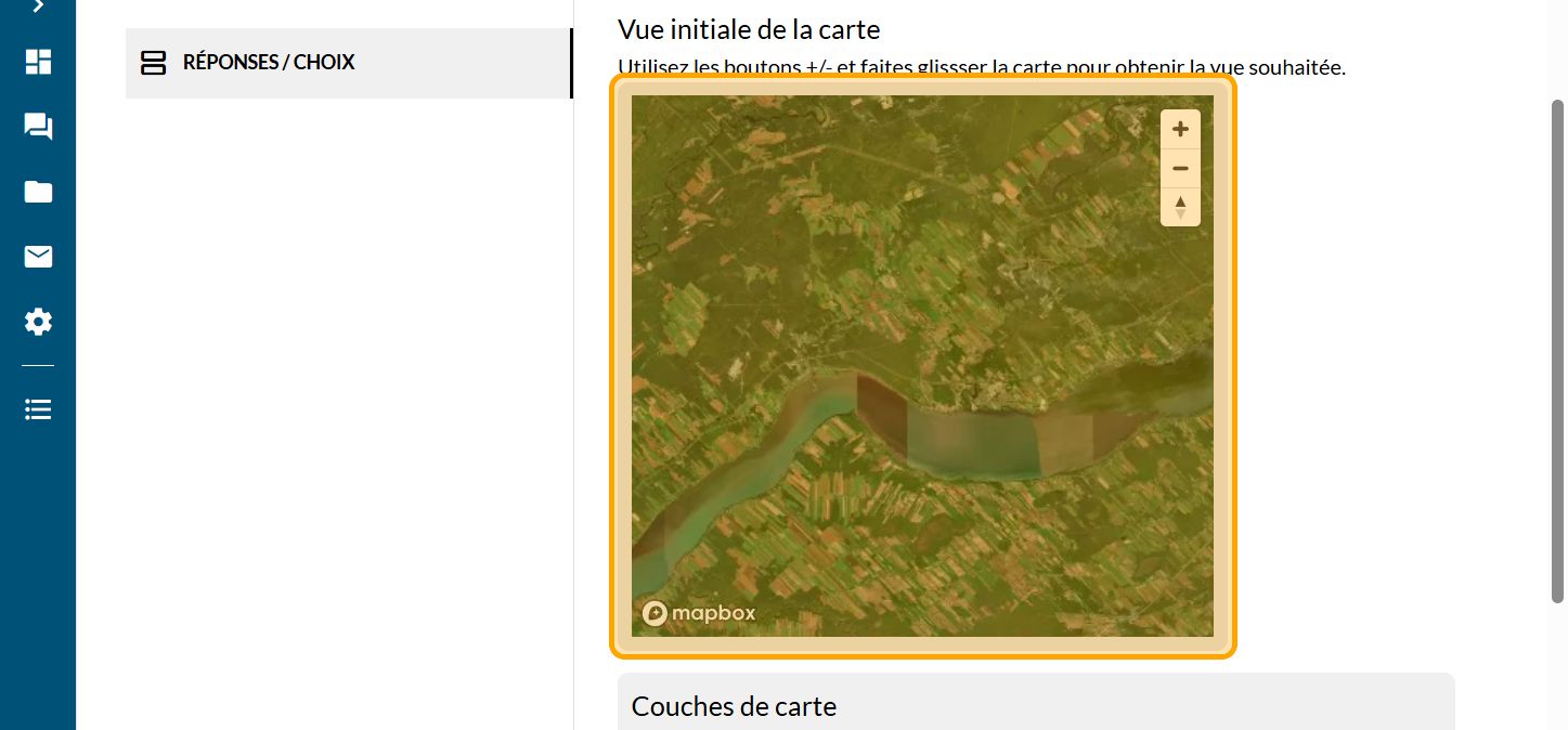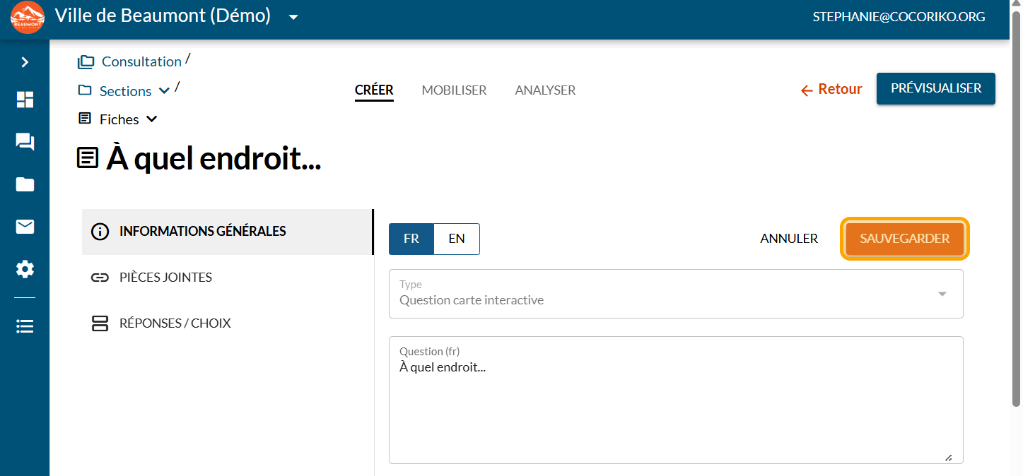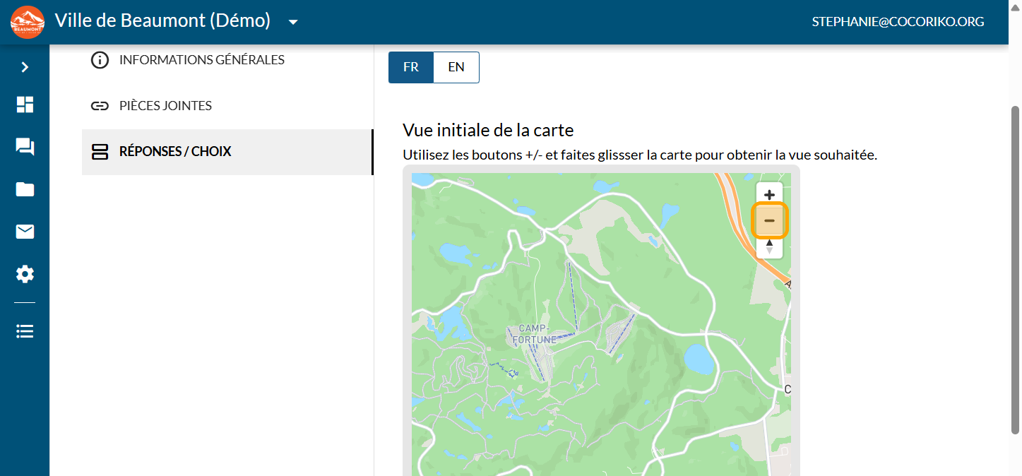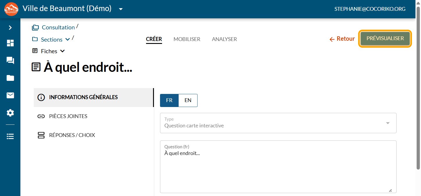 La question Carte interactive répond au besoin d'identifier des éléments sur un territoire donné que ce soit une région, une ville ou un parc. Elle permet de collecter de l'information géolocalisée. Souvent, la question ressemblera à: "À quel endroit...?".