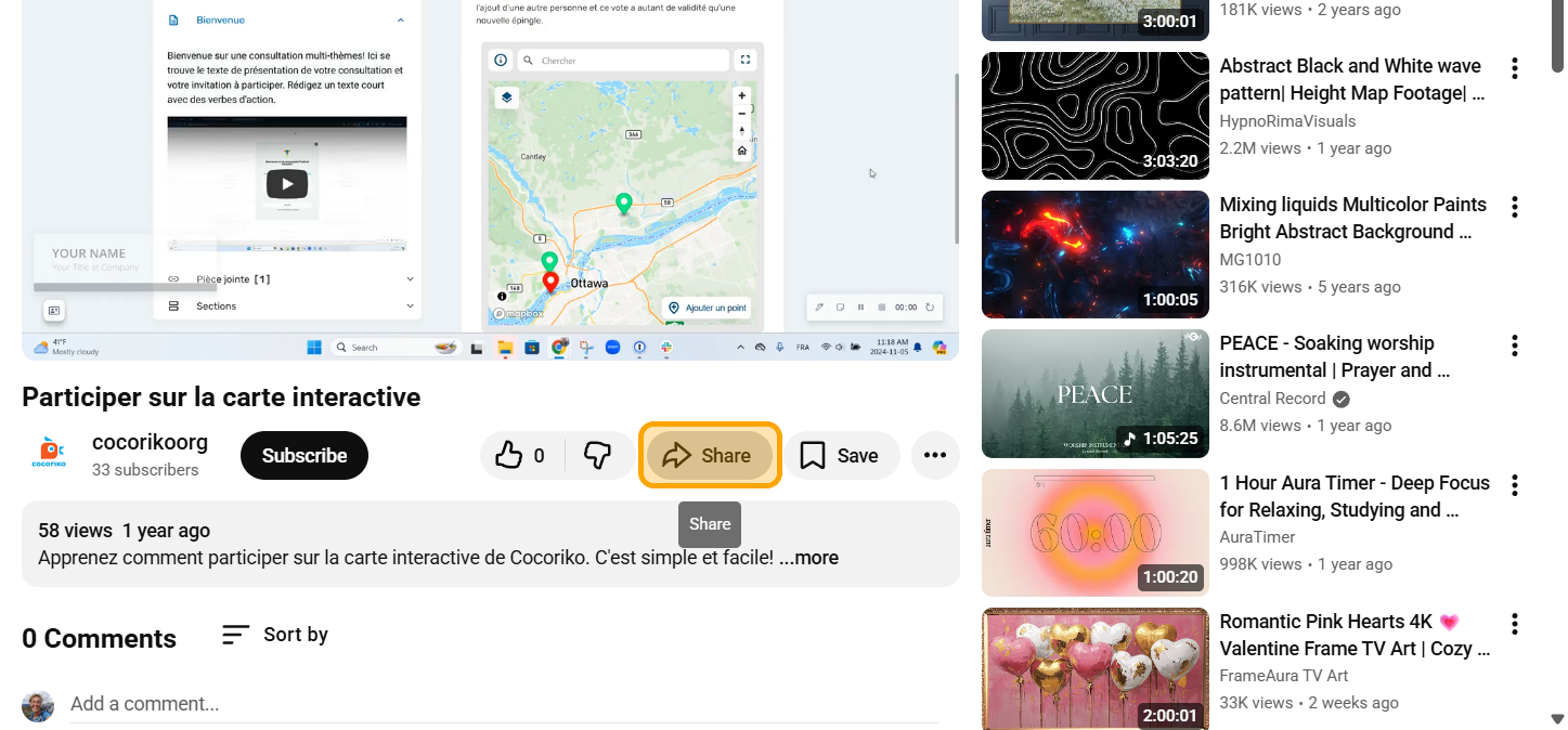 Accédez à la vidéo sur la chaîne YouTube de Cocoriko: https://www.youtube.com/@cocorikoorg/videos. Trouvez la vidéo "Participer sur la carte interactive" et cliquez sur "Partager"