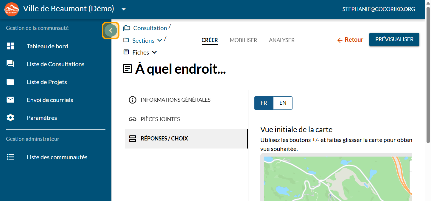 Cliquez sur la flèche pour fermer le menu de gauche et avoir plus d'espace pour travailler