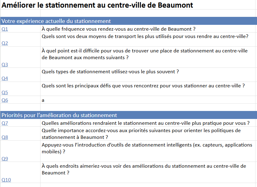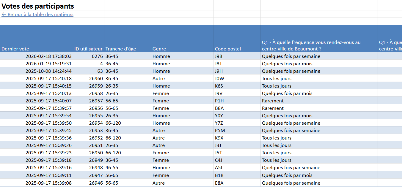 Chaque répondant est identifié par un numéro d'identification. Chaque ligne contient toutes les réponse d'un même répondant. Le groupe d'âge et le début du code postal sont inclus si vous avez conservé la collecte des données démographiques.