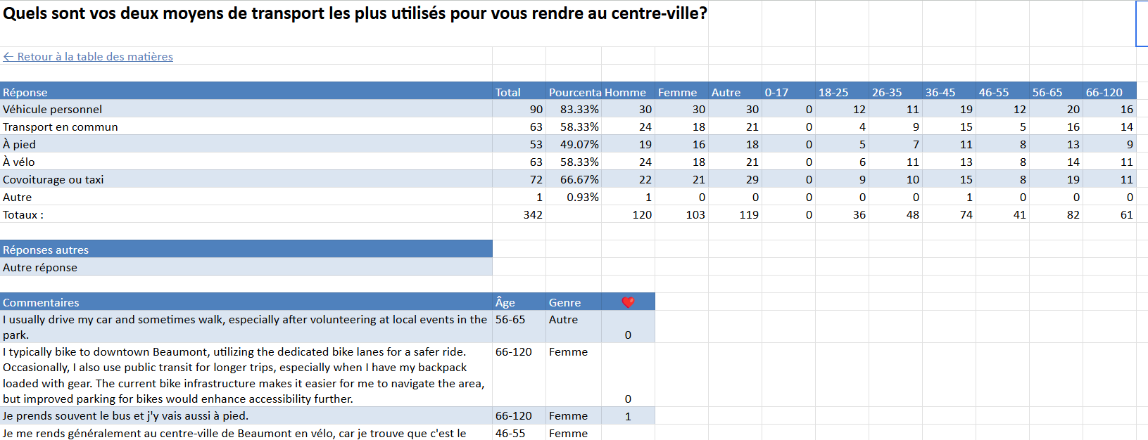 La présentation diffère légèrement selon le type de question. Le vote total est réparti par groupe d'âge et genre si vous avez conservé la collecte des données démographiques. Les réponses au choix Autre sont incluses. Les commentaires sont inclus.
