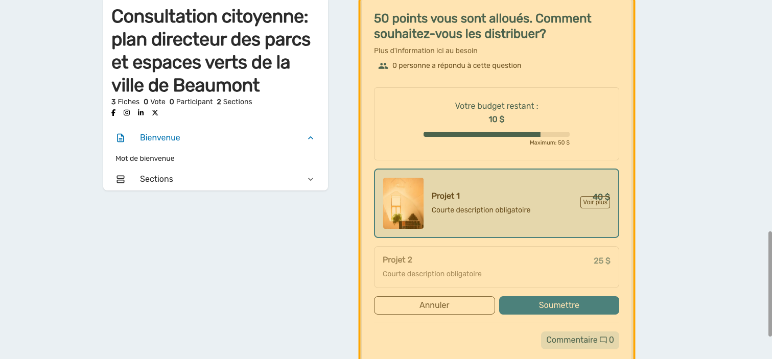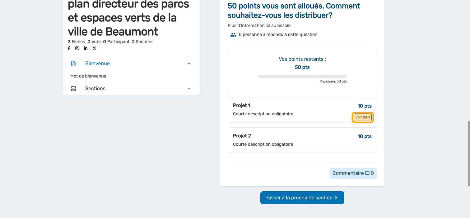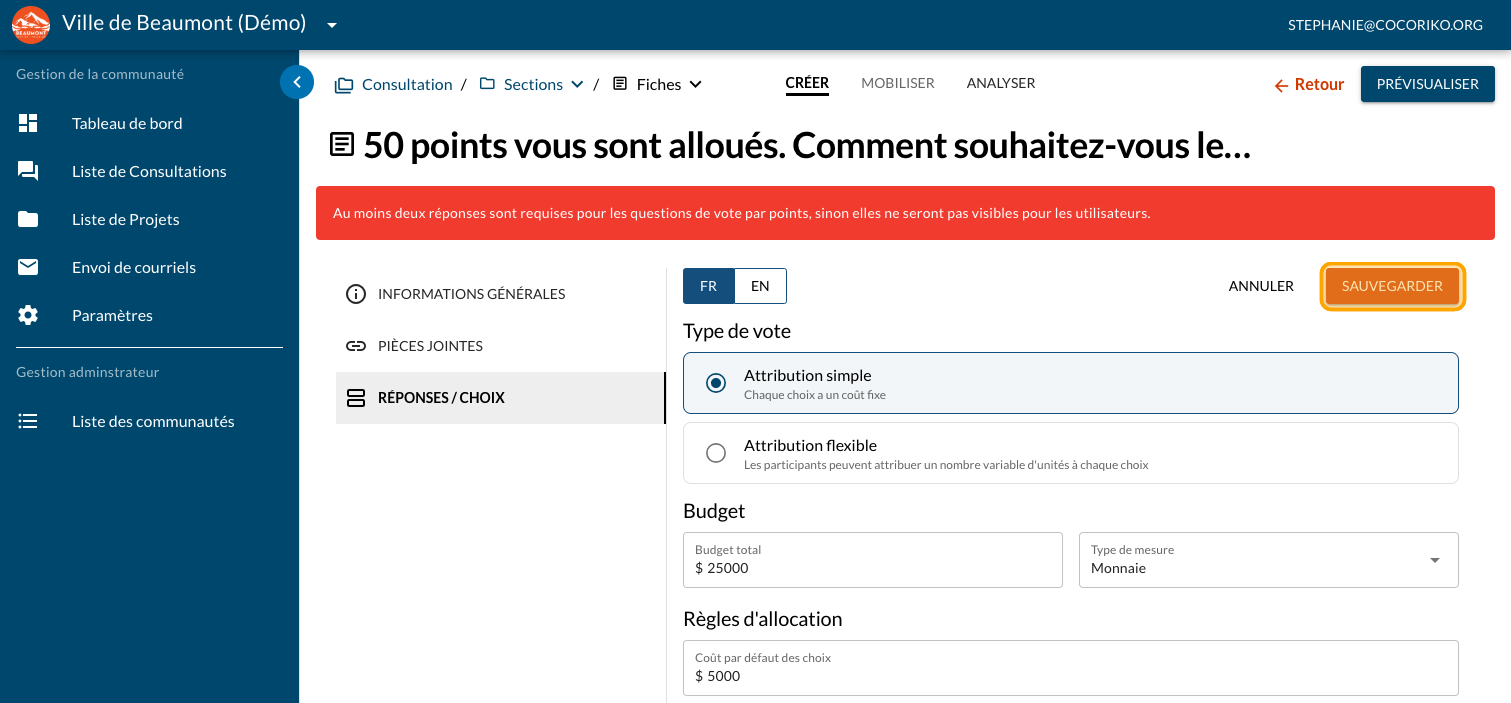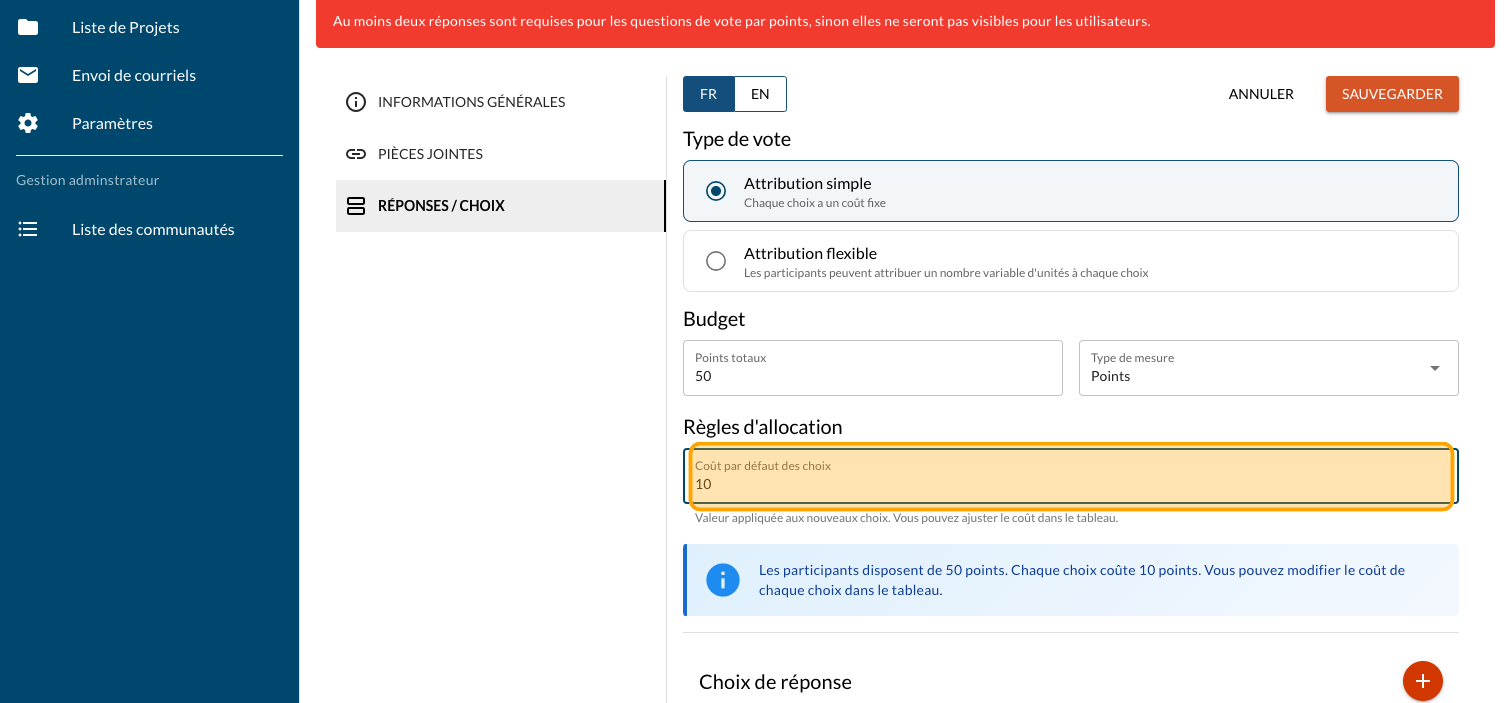 La question Vote par pointage peut être programmée avec des valeurs de choix fixes ou variables. Ce guide vous donne les étapes pour des valeurs fixes. Consultez cet article pour plus d'information.