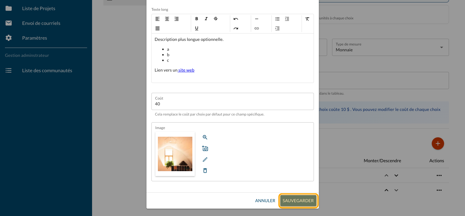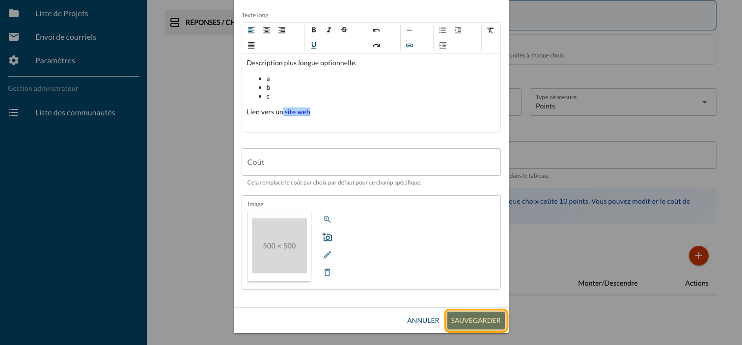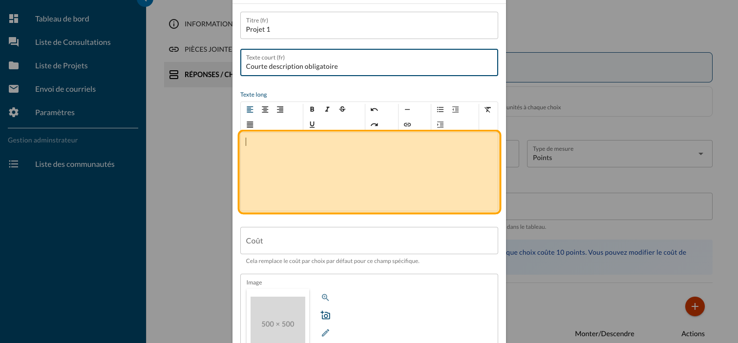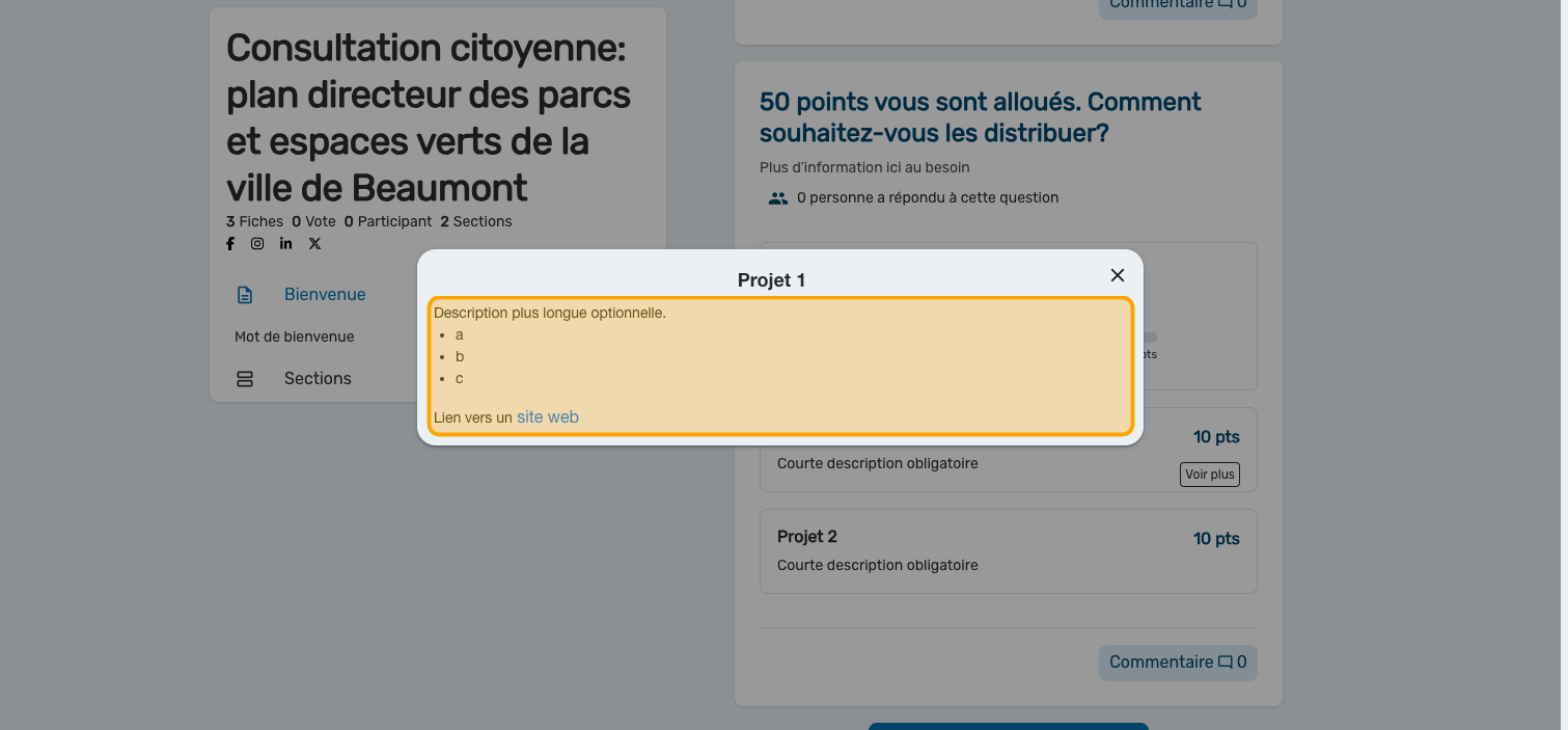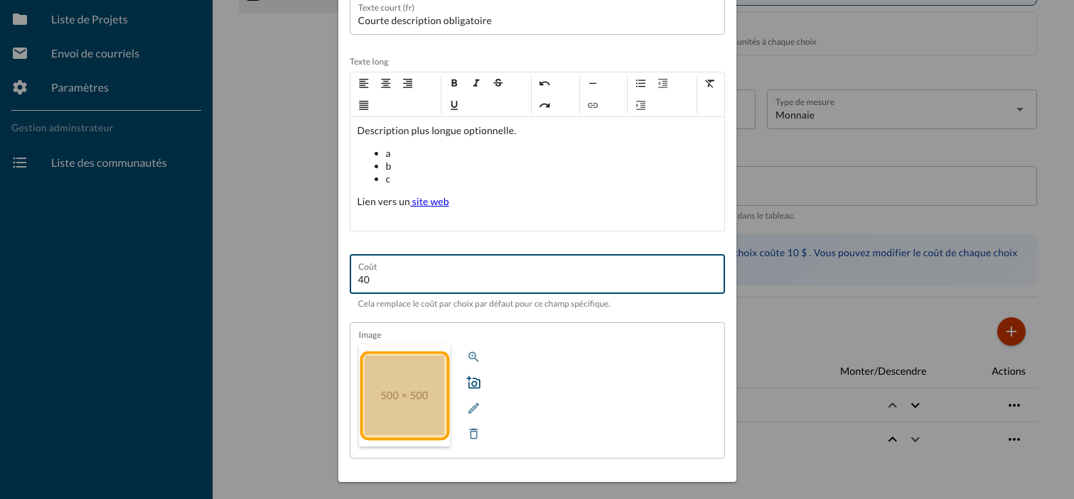 Tapez un "Texte long" optionnel pour présenter plus d'information sur le projet et un lien vers un site web ou un document explicatif (PDF)