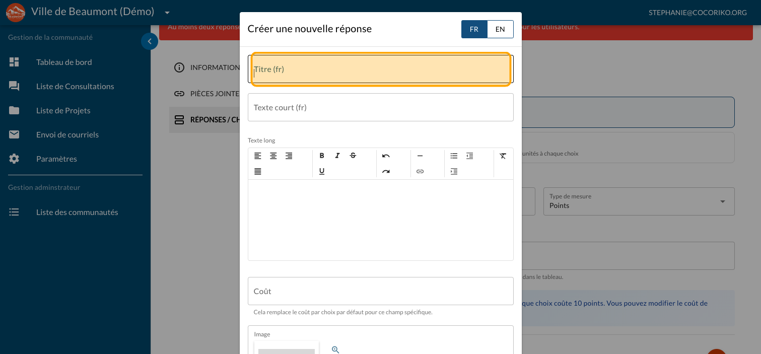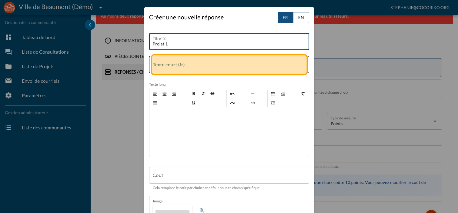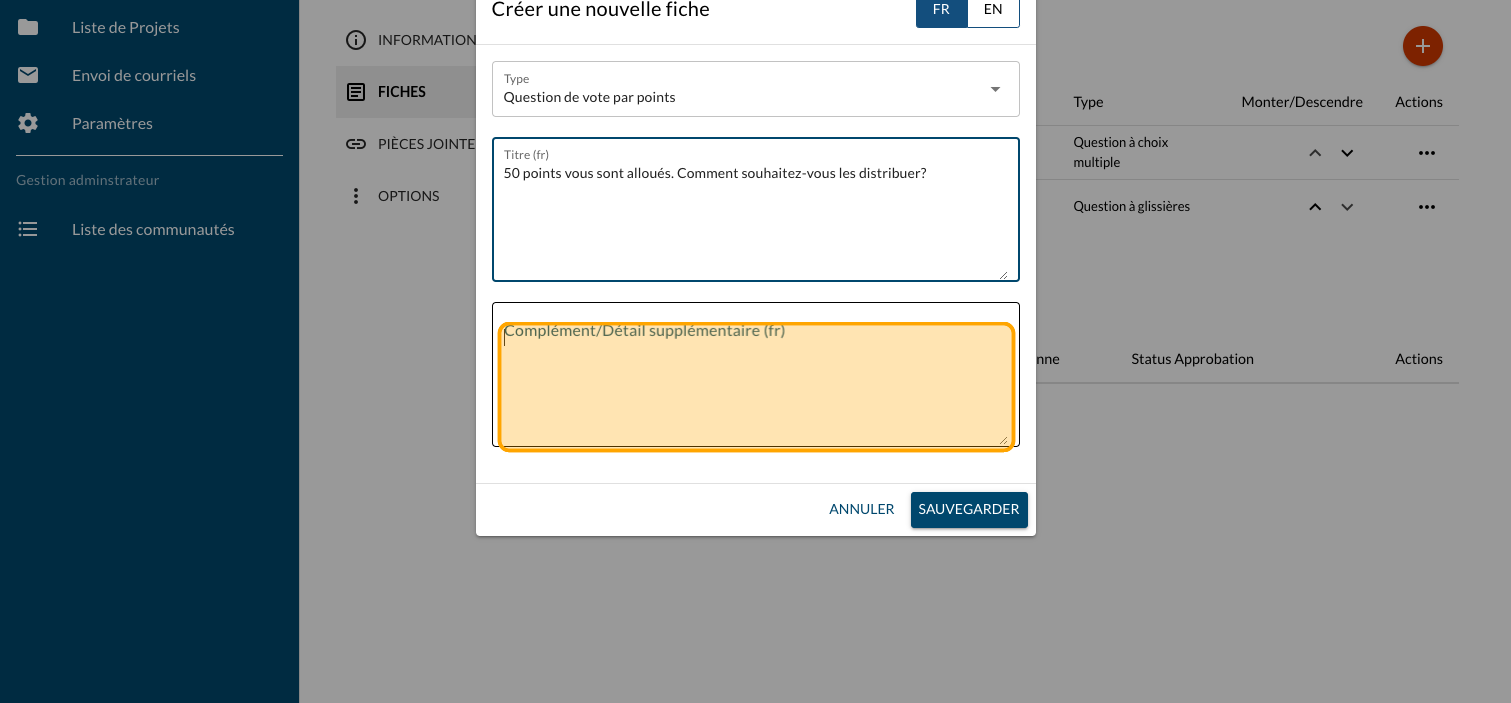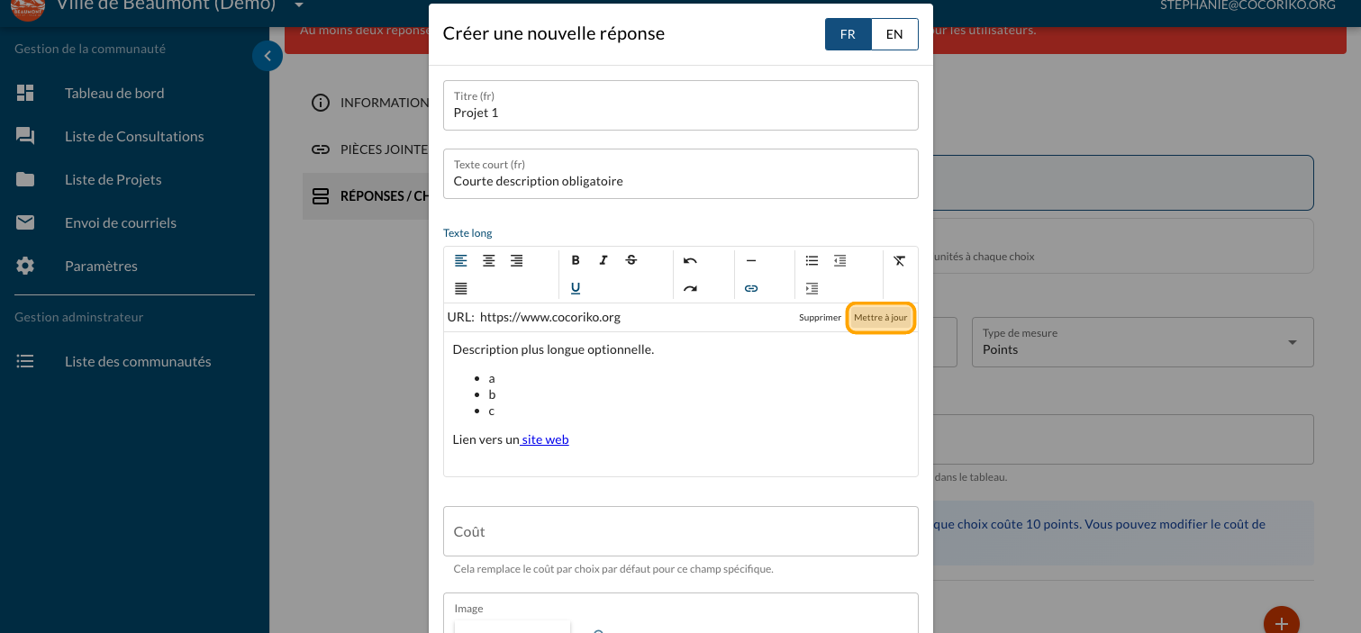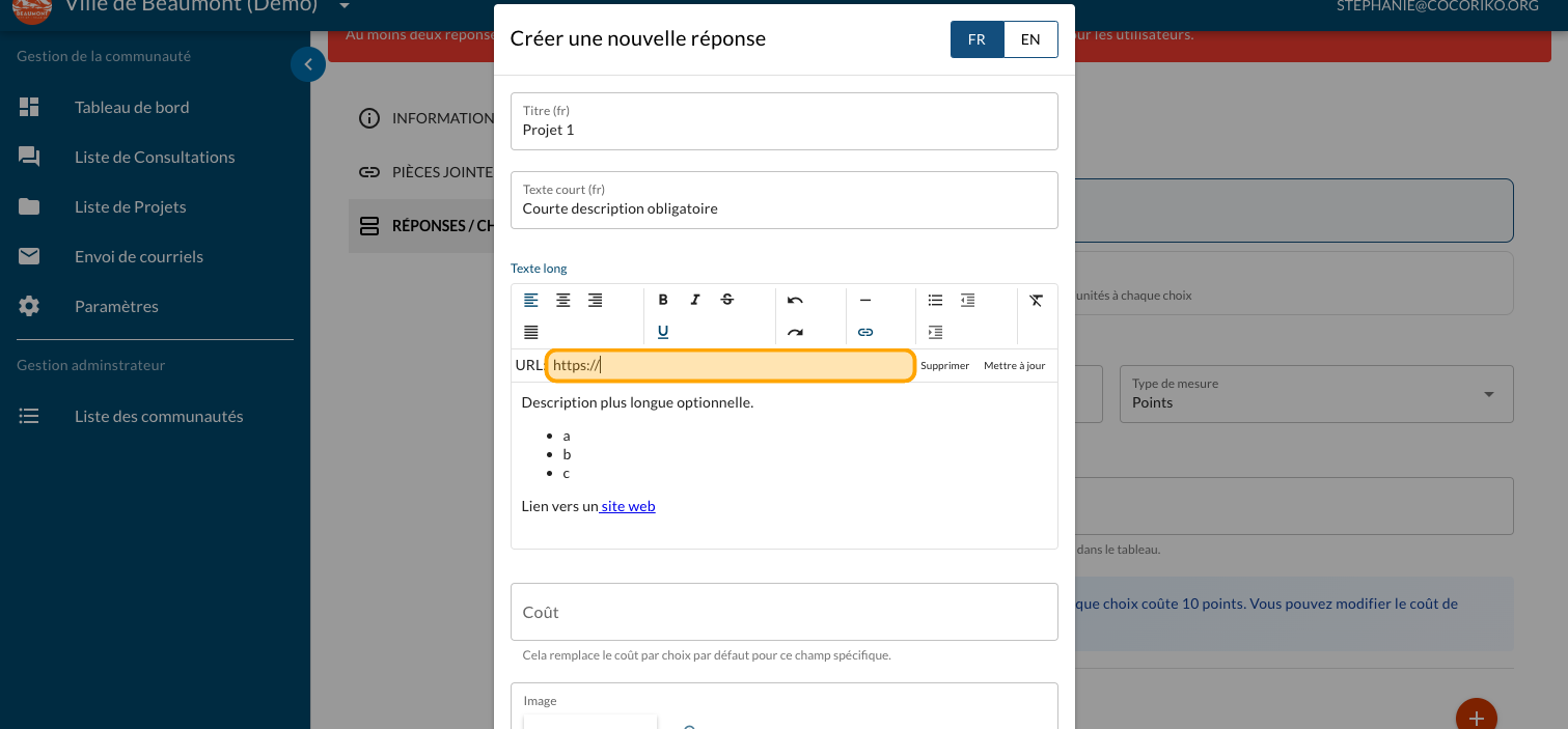 Tapez un "Texte long" optionnel pour présenter plus d'information sur le projet et un lien vers un site web ou un document explicatif (PDF)