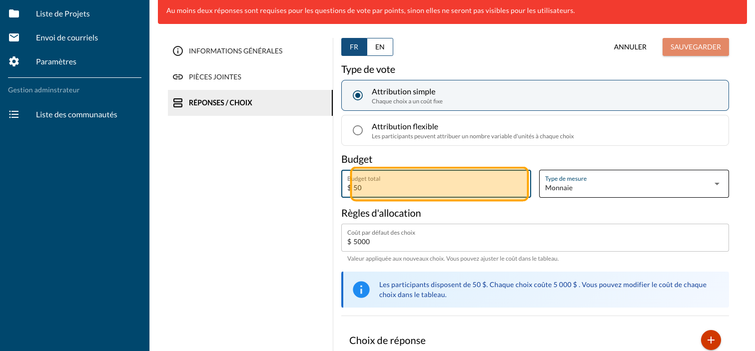 Répétez pour les autres choix de réponse pour inscrire des valeurs monétaires précises ou ajouter une image