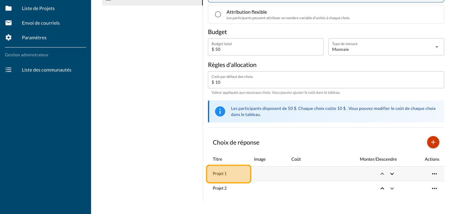 Indiquez le coût par défaut des projets