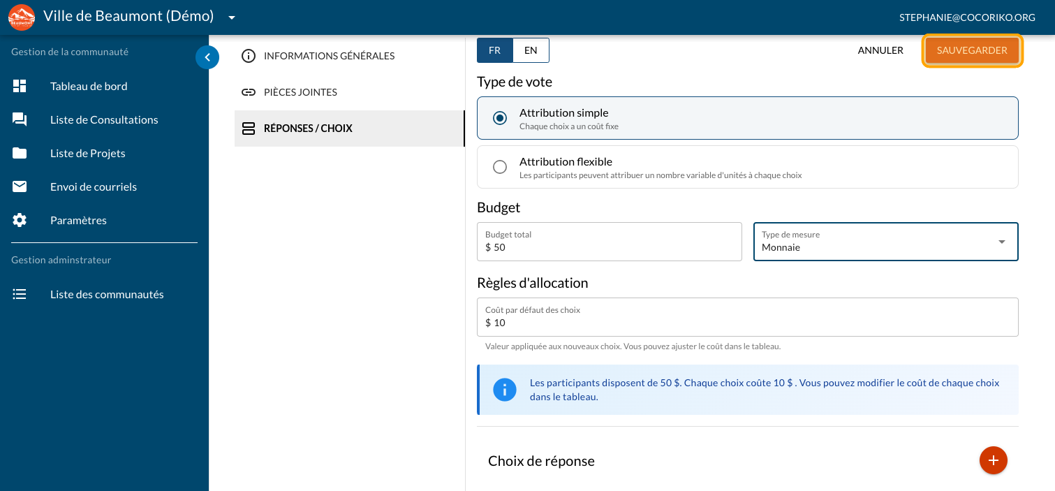 Cliquez sur "RÉPONSES / CHOIX"