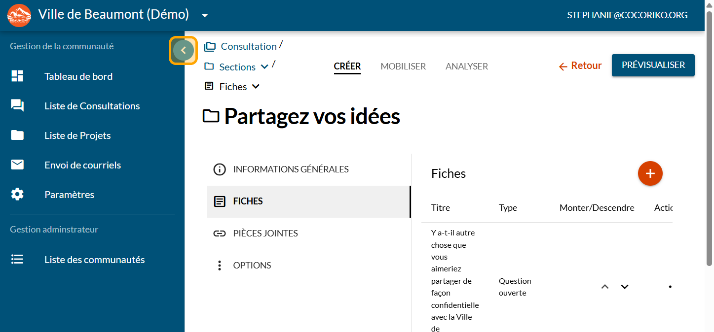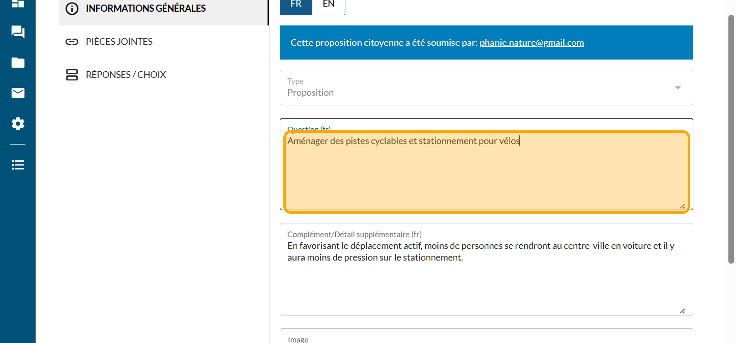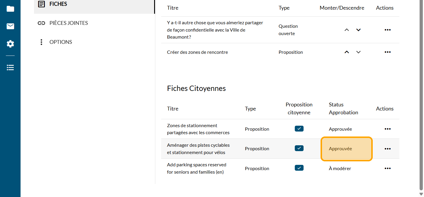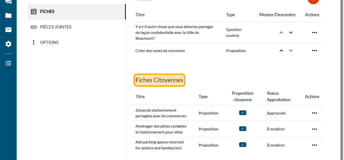 Dans la section "Fiches Citoyennes", vous verrez le propositions citoyennes. Vous aurez aussi reçu un courriel si vous avez de nouvelles propositions citoyennes à modérer.