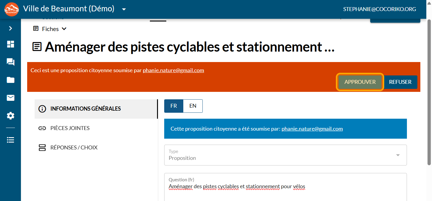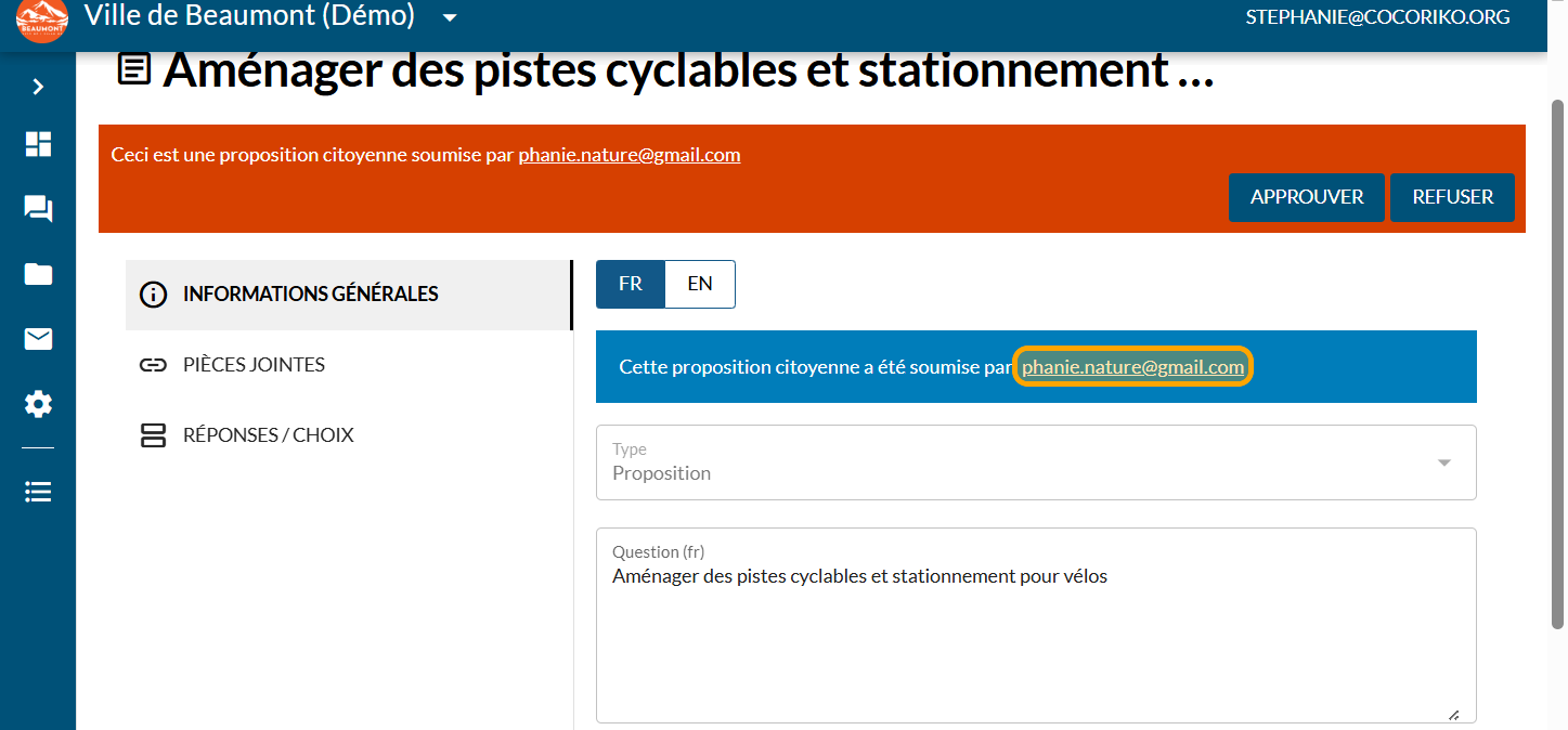 Vous avez le courriel de la personne pour échanger avec elle. Envoyez-lui un message pour lui si sa proposition est approuvée ou refusée. Vous pouvez aussi lui suggérer une nouvelle formulation.