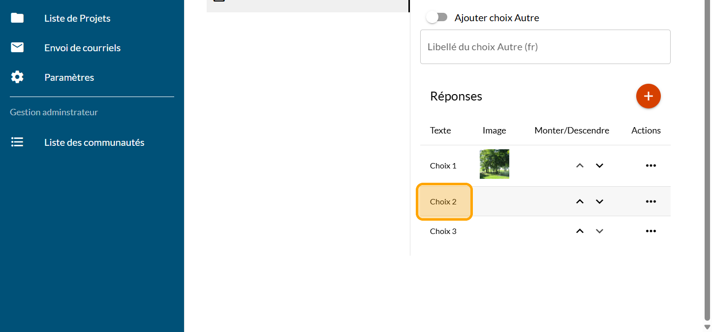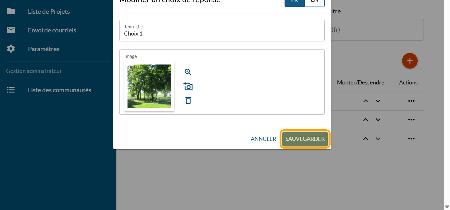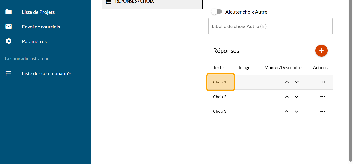 Dans l'interface de l'administration, retourner sur la question à modifier. Cliquez sur "RÉPONSES / CHOIX"